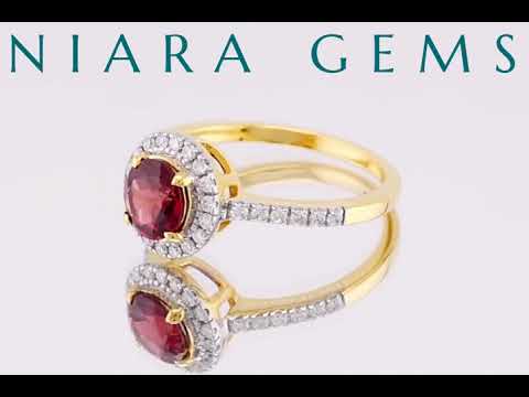 ขอแนะนำ แหวนทอง 9kt ประดับทับทิม Halo — ผสมผสานระหว่างความหรูหราแบบคลาสสิกและดีไซน์ทันสมัยอย่างลงตัว แหวนวงนี้มี ทับทิมทรงกลม เป็นอัญมณีหลัก ล้อมรอบด้วยเพชรประกายระยิบระยับ เพิ่มความโดดเด่นให้กับสีแดงสดของทับทิม ตัวเรือนประดับด้วยเพชรเม็ดเล็กเพิ่มความงดงามจากทุกมุมมอง